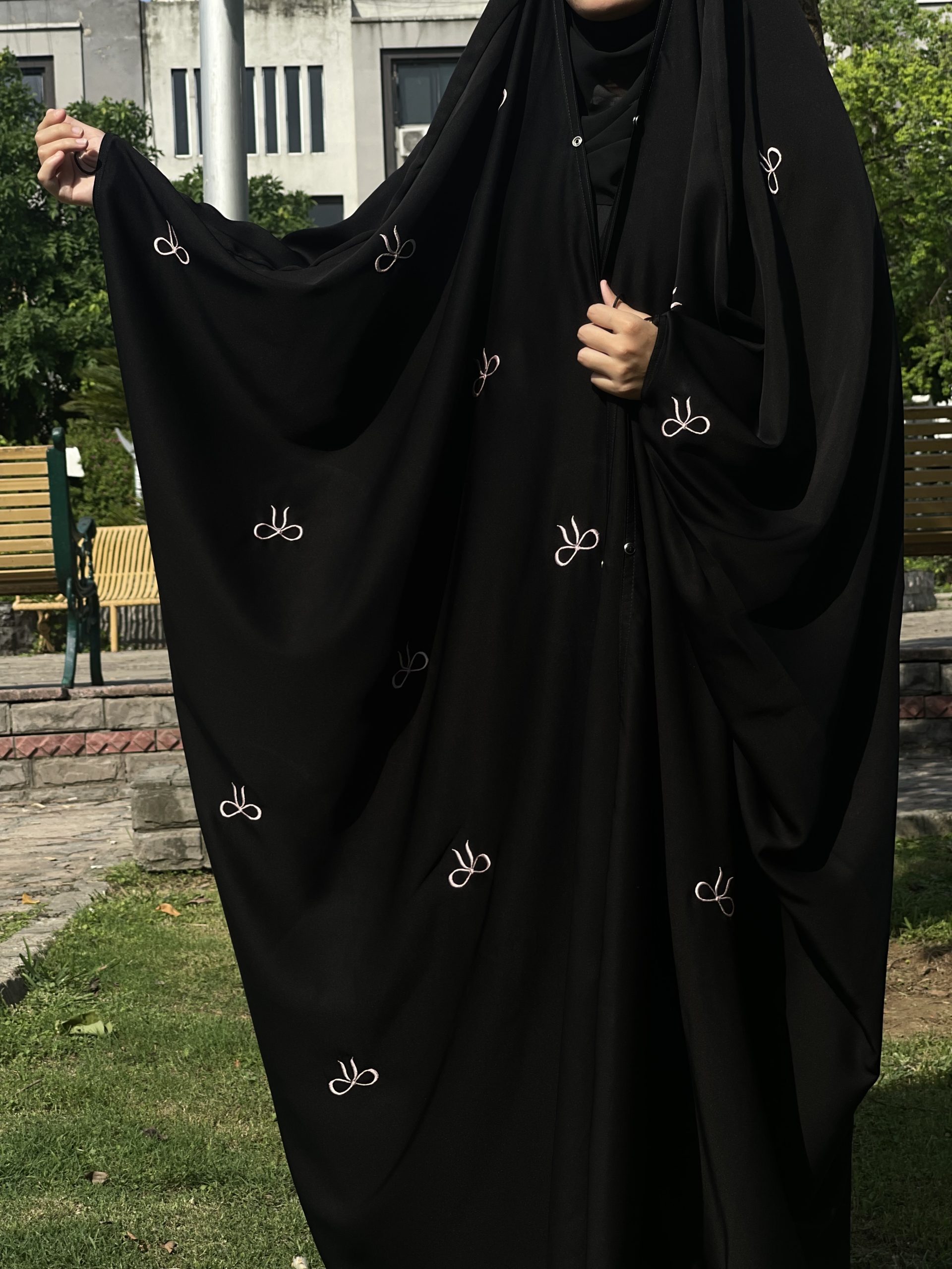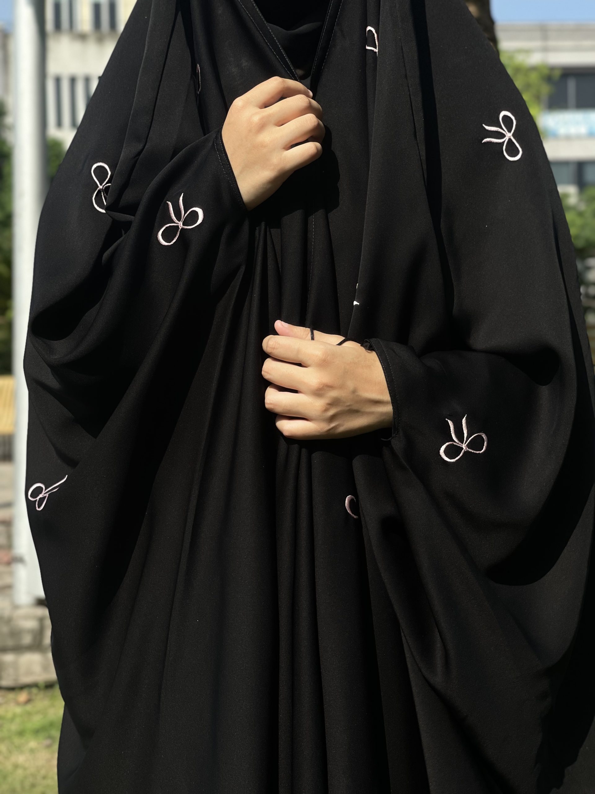The Bow Rain Irani abaya is made to feel as soft and graceful as its name. With a shower of cute bows on the abaya and patterns flowing along the front and the back, this design brings a lovely mix of texture and beauty. The bows are smooth and rich, giving the abaya a slightly luxurious and cute feel — but still keeping things modest and calm.