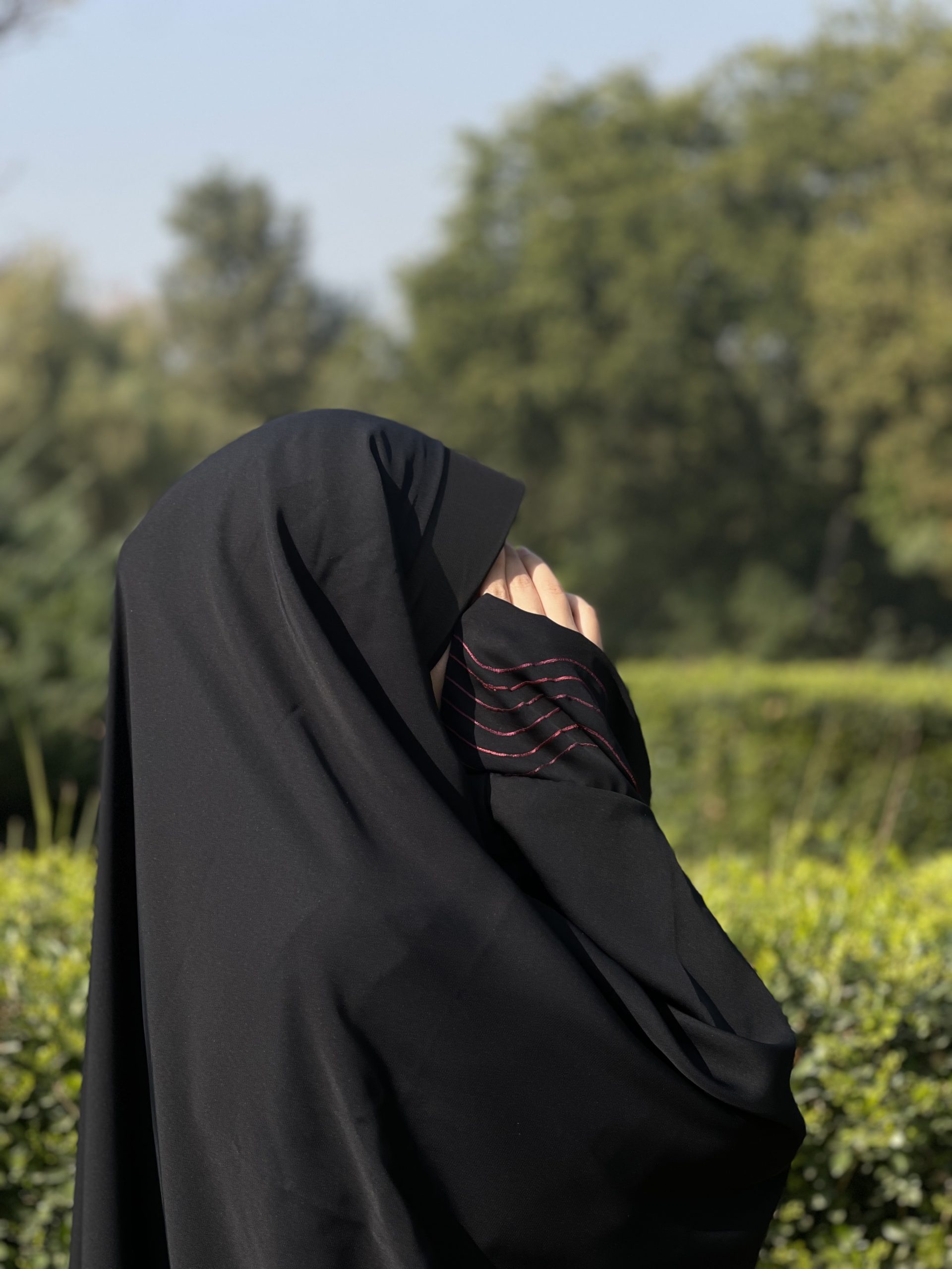 The Red Wave Irani abaya is made to feel as soft and graceful as its name. With a gentle touch of sleek red linings on the sleeves and patterns flowing along the front, this design brings a lovely mix of texture and beauty. The linings are smooth and rich, giving the abaya a slightly luxurious feel — but still keeping things modest and calm.