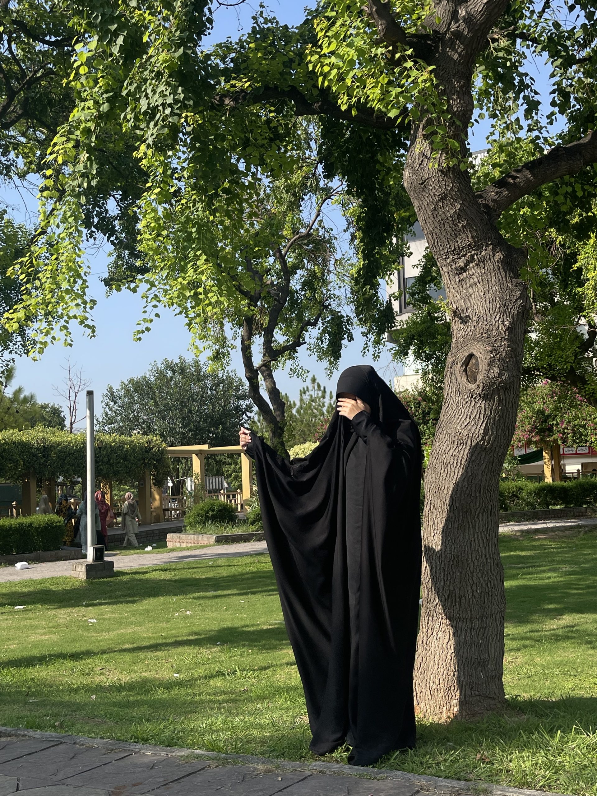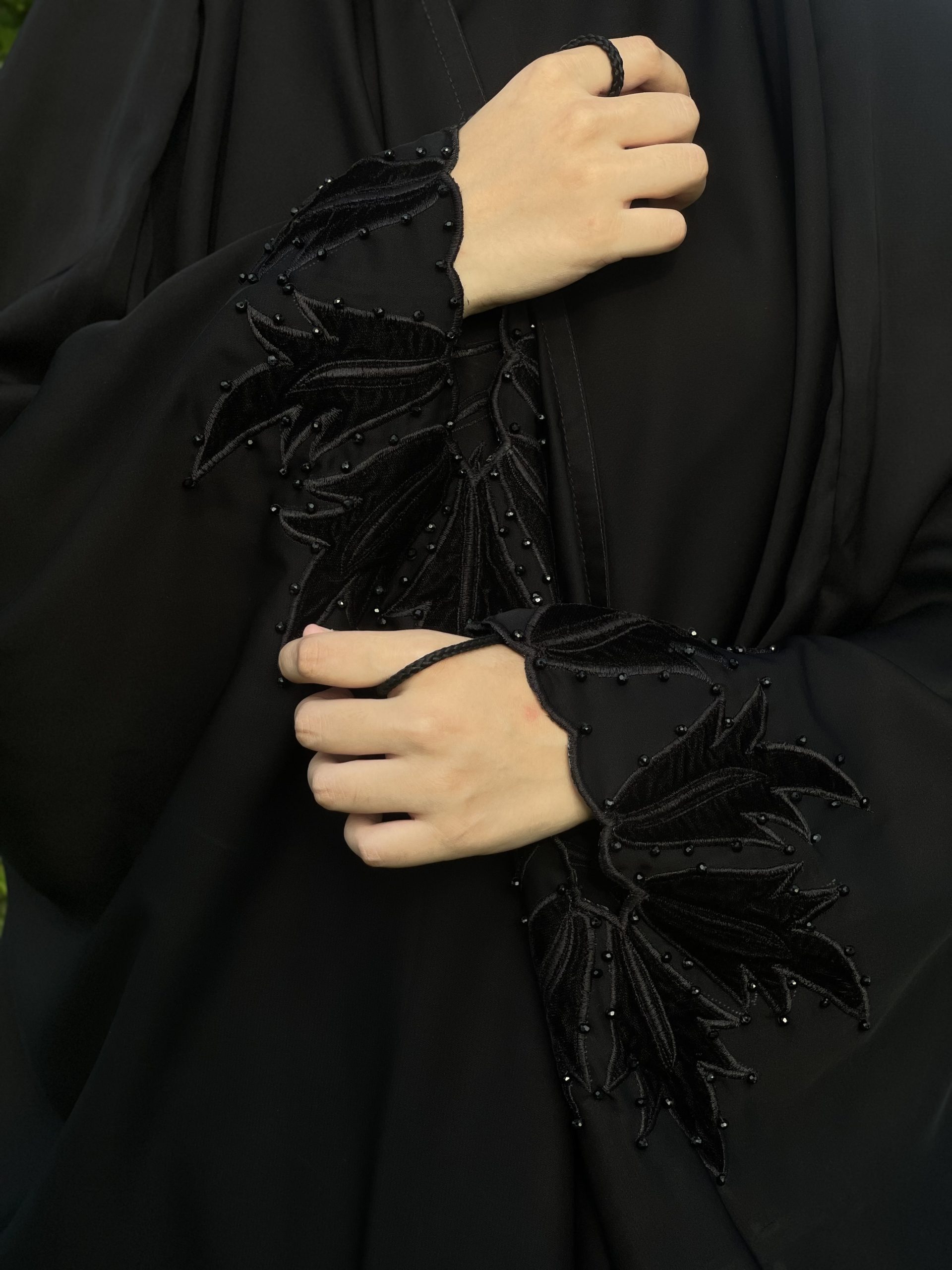 The Velvet Leaves Irani abaya is made to feel as soft and graceful as its name. With velvet leaves embroided to the sleeves along with beads at the corners, the abaya gives an elegant and crystally look, this design brings a lovely mix of texture and beauty. The beads are rich, giving the abaya a slightly luxurious feel — but still keeping things modest and calm.